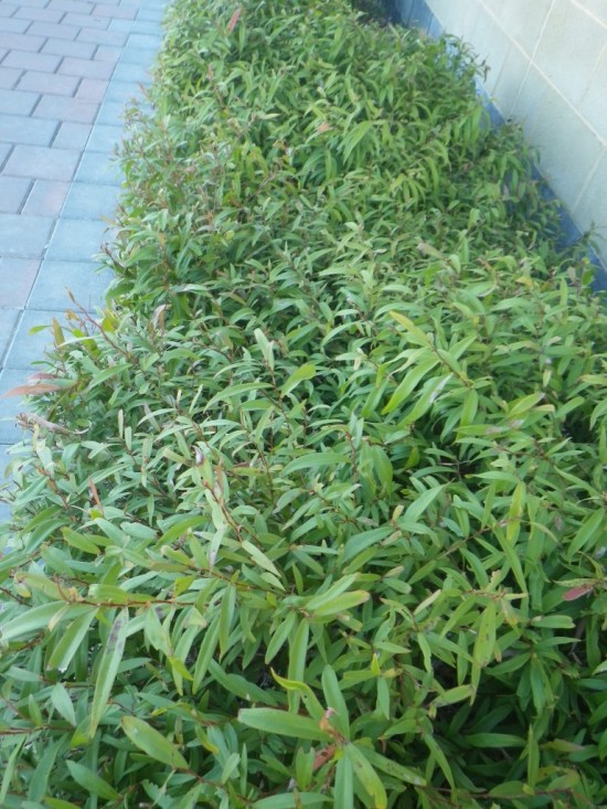 A green rounded shrub with attractive red new growth. Small white flowers are produced in summer. Australian native.