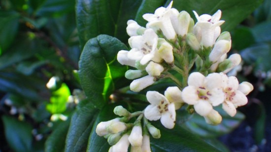A hardy, evergreen shrub with shiny green oval leathery leaves. During Spring it bears clusters of fragrant, tubular, white flowers with a faint rose tint, followed by decorative flowers