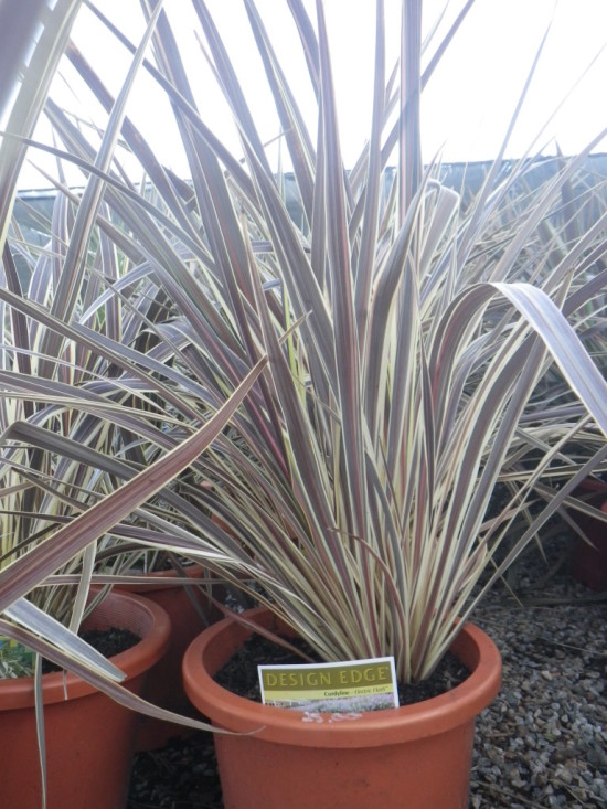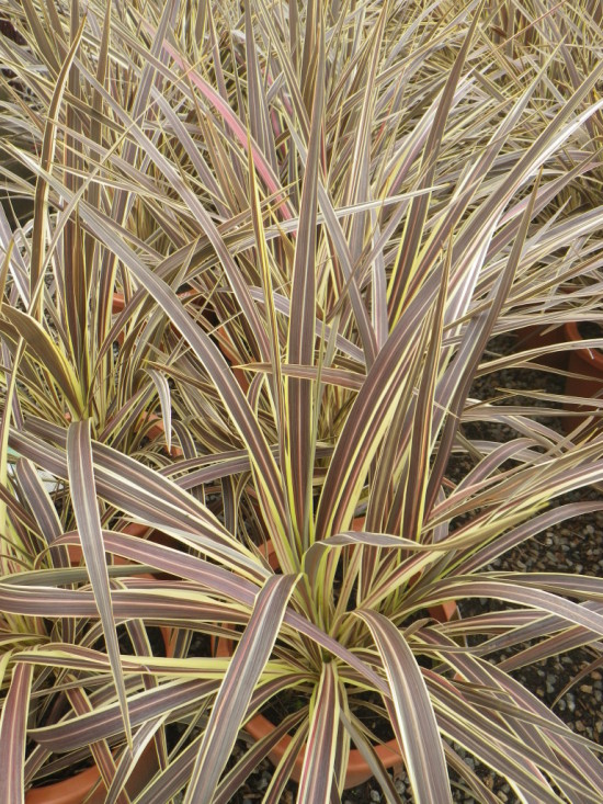 This variety of Cordyline has long, upright, slightly arching, pointed leaves of creamy green with a chocolate stripe. It doesn’t develop a bare single stem trunk like alot of other Cordylines and instead tends to develop side shoots that make it denser. Can produce a cream flower. It is compact and clumps.